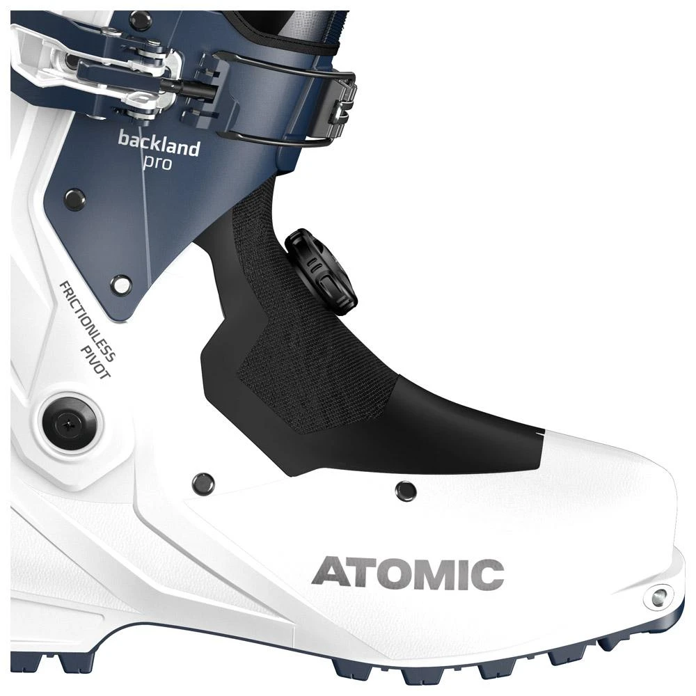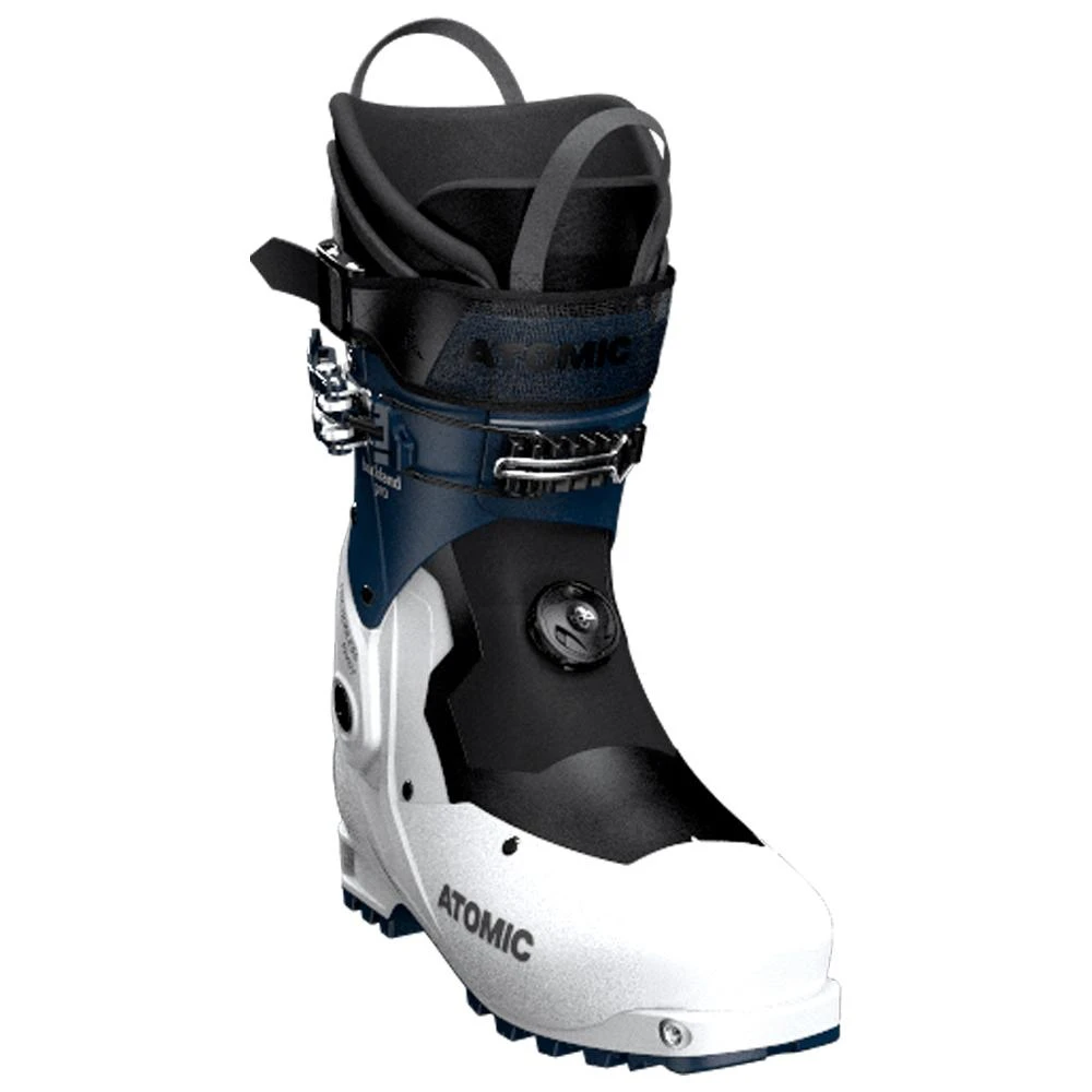 L’Atomic Backland Pro W profite de la construction Prolite, ce qui lui permet de ne peser que 1 030 grammes (par chaussure en taille 24/24.5 ), mais d’offrir une excellente réactivité et beaucoup de contrôle à la descente. Sa boite à orteils de 98 mm, son renfort Energy Backbone, son serrage Boa et son strap de 40 mm la rendent ainsi bonne descendeuse, tout en étant bluffante à la montée notamment grâce aux 74° de de débattement offerts par le système ski/marche Free/Lock 4.0.