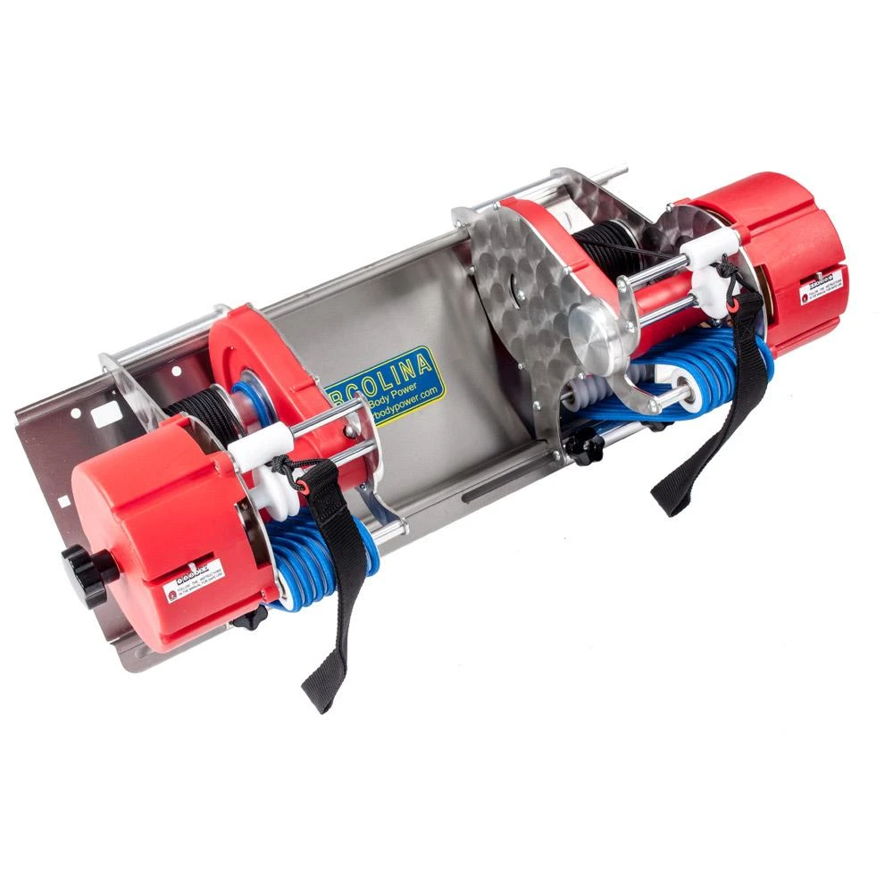 Concernant la machine elle même les caractéristiques restent les mêmes, son but est de simuler parfaitement la gestuelle de la double poussée dans le but d’accroître ou d’entretenir la puissance musculaire du skieur. Son système de câbles permet un travail aussi bien musculaire que technique avec un respect total des temps de poussée, qu’ils soient brefs et intenses ou longs et plus lents. Cela permet également de travailler la coordination du pas alternatif car les deux unités de résistances sont indépendantes. Le travail musculaire concerne l’ensemble des groupes musculaires du tronc et aide à stabiliser le torse et la colonne vertébrale. Cela permet un travail foncier et lactique qui renforce la résistance des skieurs sur les fins de course. Dotée d’un frein magnétique, on peut également jouer sur la résistance selon le type de séance à effectuer. On peut donc régler la résistance entre les phases d’entraînement (échauffement, spécifique et récupération. La largeur est également adaptable pour s’ajuster aux largeurs d’épaules d’utilisateurs différents et simuler au mieux leur geste de poussée.